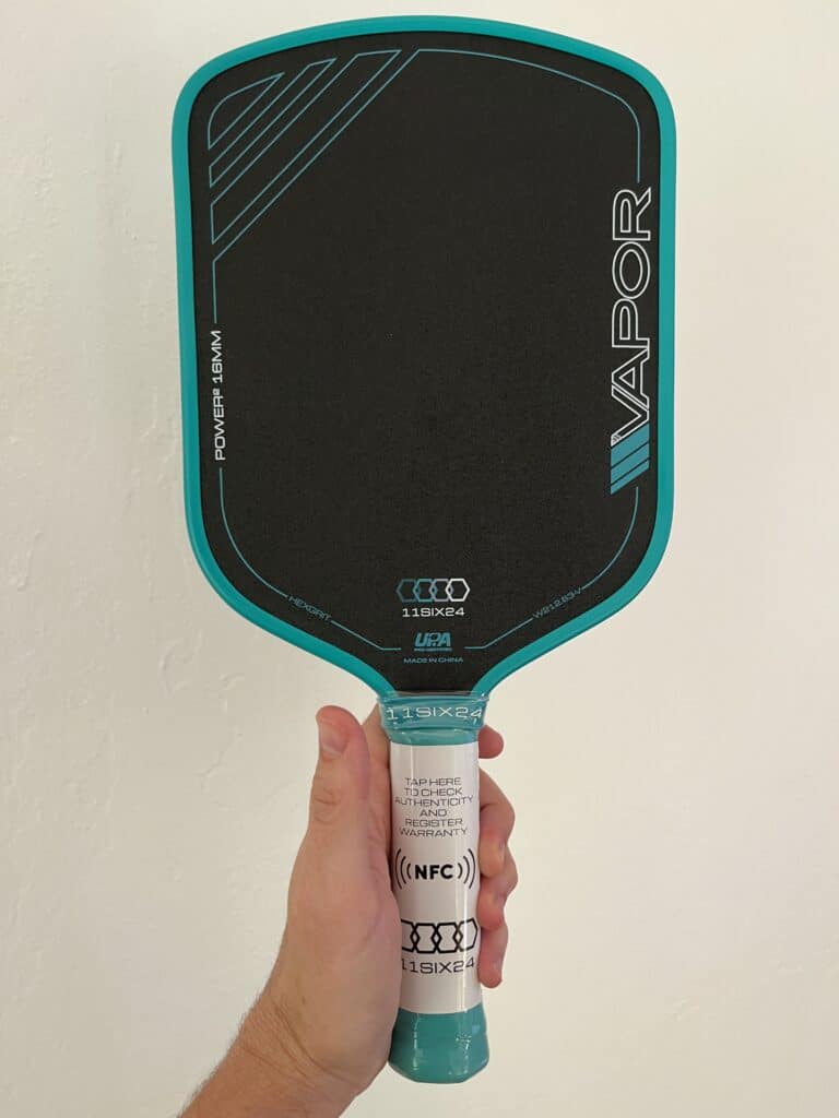 The 11six24 Vapor Power paddle immediately caught my attention. The design blends sleek black with electric teal accents, giving it that bold, energetic look that turns heads on the court. From the first hit, I could tell this paddle packs a punch.
