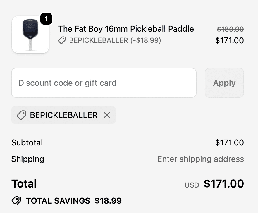 - On the right, you would add “BEPICKLEBALLER” to the Discoun Code or gift card, and click Apply.