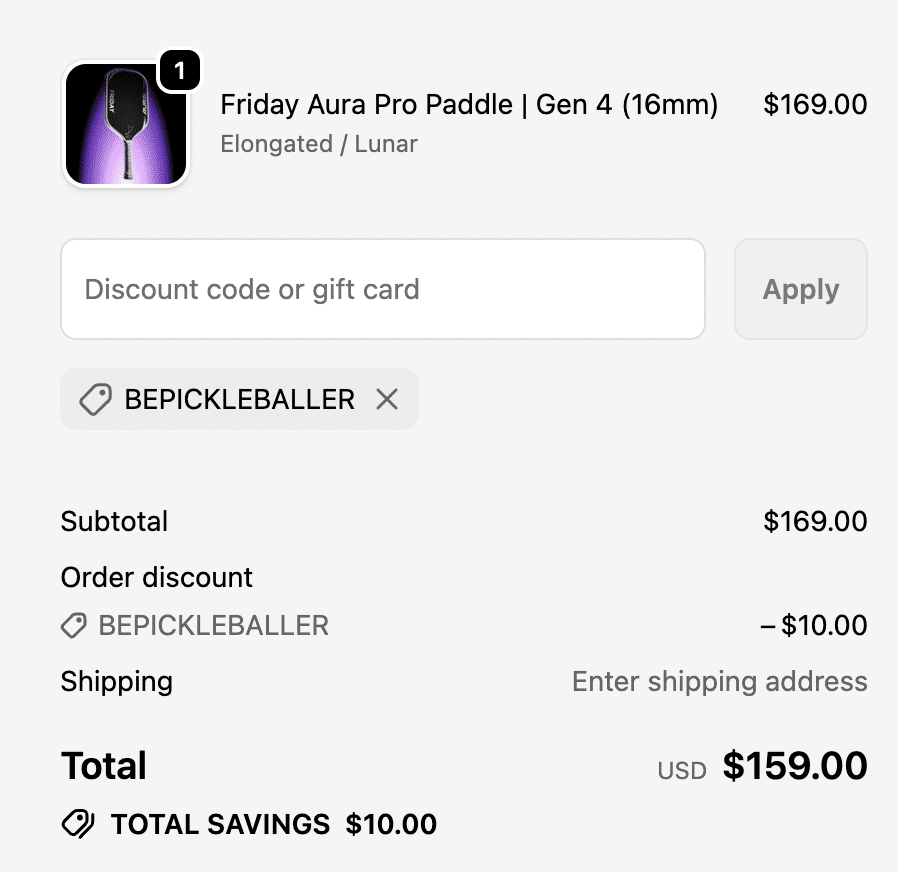 That said, the Aura Pro paddle is $169.00, so I felt that I had to find the best Friday pickleball paddle discount code: BEPICKLEBALLER that takes $10 off the paddle. The paddle is still $159 after the code, but any amount counts considering Friday already has value paddles.