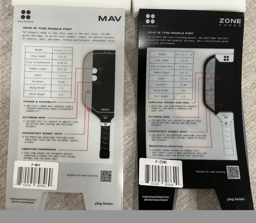 Even though the paddles share some similar specs on paper, they play quite differently on the court. The Holbrook Mav 2.0 is designed more as an all-court paddle that blends control, spin, and maneuverability. It was definitely better than my Holbrook Mav first version. The Zone, on the other hand, leans more toward aggressive power and stability.