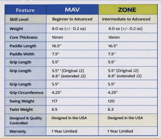The Mav 2.0 is an outstanding value paddle that plays above its price point, while the Zone feels like a modern power paddle designed for the current fast-paced game.