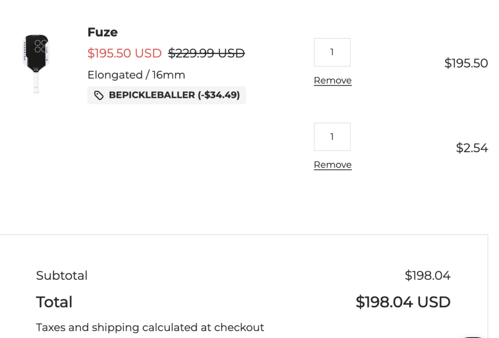 - Add Code: BEPICKLEBALLER and click apply, and boom, the Holbrook paddle is nearly $35 off the new Fuze. Here’s the screenshot: