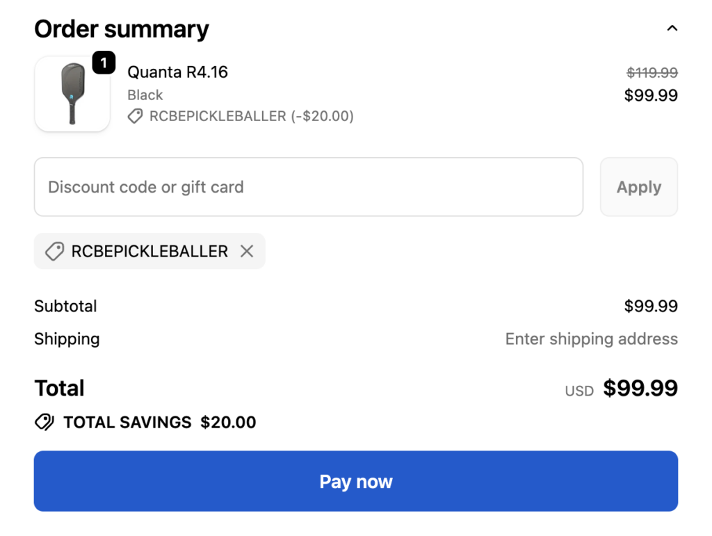 - Add the code, “RCBEPICKLEBALLER” and you will see the $20 off taken off immediately. Here’s the screenshot showing the discount for the Ronbus Quanta.
