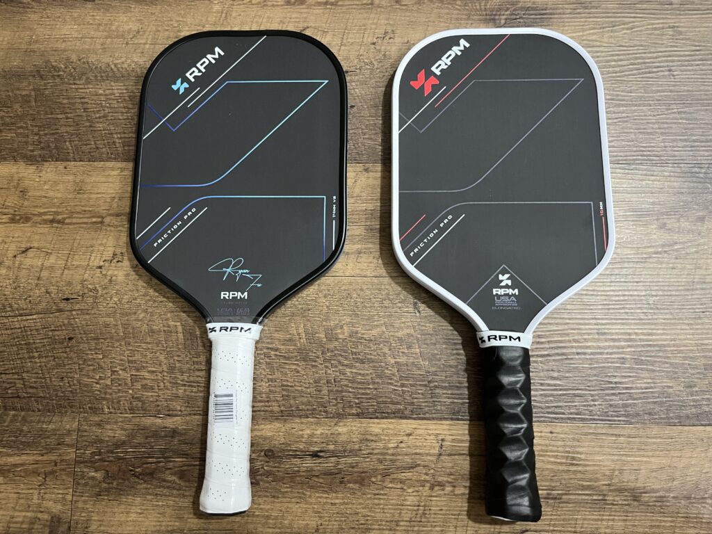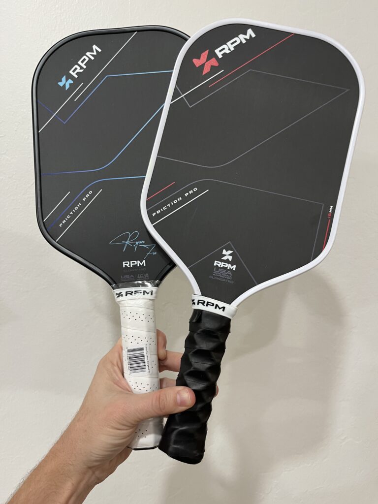 I wanted to hold the RPM V2 vs V1 to show you a comparison of the paddle’s grip. The paddles feel similarly in terms of the paddle’s shape and grip length. Please note that my RPM v1 has a Hesacore grip.