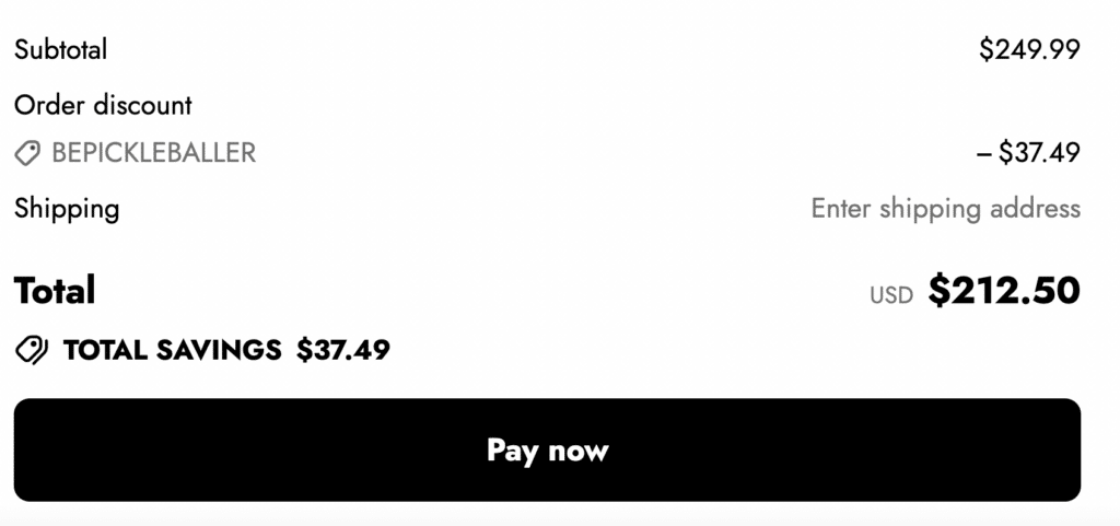 - Then you would click “Check out”, and you can see that the code has been successfully applied to reduce the paddle to $212.50.